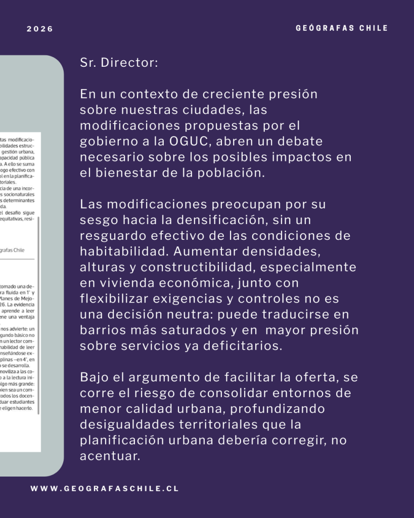 Ante la consulta ciudadana disponible en la página del MINVU sobre la “Modificación de la Ordenanza General de Urbanismo y Construcciones”, creemos que corresponde a un cambio ideológico y estructural de cómo se planifica el territorio. Afecta la autonomía de las municipalidades y sus habitantes, que tienen derecho a decidir vinculantemente cómo debe crecer la ciudad.
