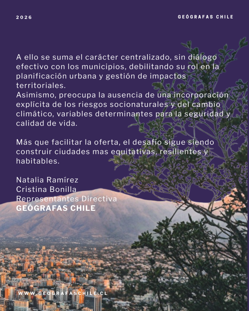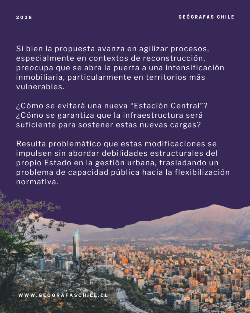 Si bien la propuesta avanza en agilizar procesos, especialmente en contextos de reconstrucción, preocupa que se abra la puerta a una intensificación inmobiliaria, particularmente en territorios más vulnerables.
