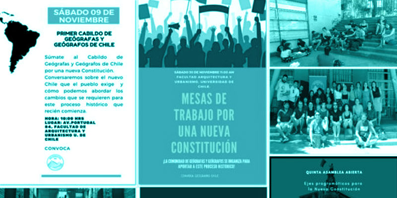Mesas de Trabajo por la Nueva Constitución es una articulación de profesionales y estudiantes de Geografía y carreras afines que surge en respuesta a la demanda por espacios de diálogo y encuentro desde la disciplina, con miras al cambio constitucional y el momento político a partir del estallido social en octubre de 2019. En éstas se ha debatido el rol de los profesionales de la Geografía en el ámbito disciplinar y académico, en la construcción de una nueva sociedad para el país, en generar un ordenamiento territorial sustentable, la necesidad de participación ciudadana representativa y vinculante, nuevas redes de gestión comunitaria, descentralización y poder local, entre otras temáticas, para plasmar en la nueva Constitución. Se han desarrollado cinco encuentros en los que se ha problematizado la situación, generando diagnósticos y propuestas, una campaña con material informativo crítico para difundir -previo al Plebiscito de entrada- y actualmente en desarrollo, un programa de temáticas a considerar dentro de la redacción de la nueva carta magna. Estos encuentros han sido coordinados desde la plataforma de la Asociación Geógrafas Chile y la red de trabajo colaborativo, horizontal y con alto nivel de compromiso de cada una/e/o de quienes participan.